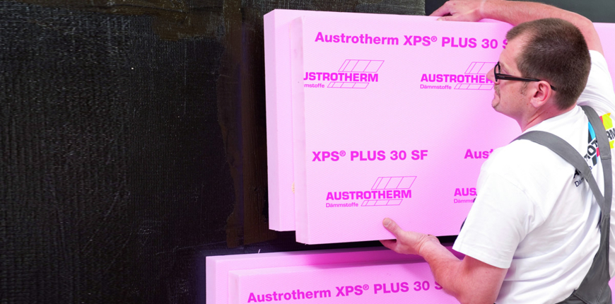 Ściany fundamentowe narażone są na działanie wilgoci przenikającej z otaczającego budynek gruntu, dlatego należy je odpowiednio zaizolować. Styrodur na fundamenty stosuje się inaczej niż na płytę fundamentową. Izolacja termiczna układana jest „obwodowo” na całej ścianie fundamentowej budynku po jej zewnętrznej stronie od poziomu ławy fundamentowej do miejsca, w którym zaczyna się izolacja termiczna ściany zewnętrznej. Grubość izolacji termicznej wykonanej z płyt XPS wynosi zazwyczaj od 10 cm do 30 cm (dla domów pasywnych). Kluczowe jest, aby całość izolacji – przeciwwodna i termiczna – była wykonana prawidłowo. Zabezpieczenie ścian fundamentowych powinno składać się z wodoszczelnej izolacji pionowej wykonanej przy użyciu masy izolacyjnej oraz osłony w postaci wodoodpornych termoizolacyjnych płyt XPS, które ochronią ją zarówno przed uszkodzeniami mechanicznymi, jak i utratą ciepła. W takim przypadku obligatoryjnie należy użyć izolacji wodoszczelnej oraz kleju dedykowanego do płyt XPS – to kleje bitumiczne lub kleje poliuretanowe. W przeciwnym wypadku zawarte w tych materiałach rozpuszczalniki doprowadzą do degradacji izolacji termicznej fundamentu. Prawidłowo dobrane kleje gwarantują również odpowiednią przyczepność przy klejeniu płyt. W przypadku niskiego poziomu wody gruntowej zaleca się klejenie płyt na placki lub pionowe warkocze w zależności od zastosowanego kleju. Płyty XPS przyciąć trzeba na wymiar za pomocą specjalnych narzędzi – sprawdzają się piła z bardzo małymi ząbkami, nóż termiczny, który pracuje z temperaturą 100-450°C lub ploter termiczny. Płyty XPS kleimy do ściany „mijankowo”, tzn. z przesunięciem spoin płyt o 1/2 ich długości, płyty należy łączyć na zakład z wykorzystaniem krawędzi L. Mogą być one układane poziomo lub pionowo w zależności od rozwiązań projektowych. Uwaga! Płyt XPS w żadnym wypadku nie należy mocować mechanicznie. Zasypanie fundamentów gruntem może nastąpić dopiero po zabezpieczeniu ich folią kubełkową i wyschnięciu kleju.